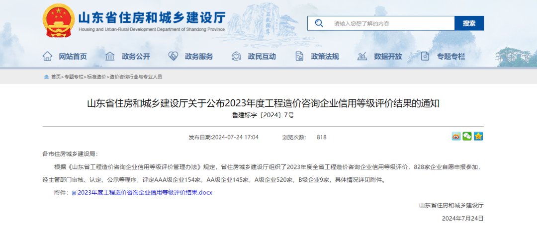 7月24日,山東省住房和城鄉(xiāng)建設(shè)廳公布了“2023年度山東省工程造價(jià)咨詢企業(yè)信用等級(jí)評(píng)價(jià)結(jié)果”,全省共有828家企業(yè)參加本次評(píng)審,我公司在此次造價(jià)咨詢企業(yè)信用等級(jí)評(píng)價(jià)中獲得最高“AAA等級(jí)”評(píng)價(jià)。